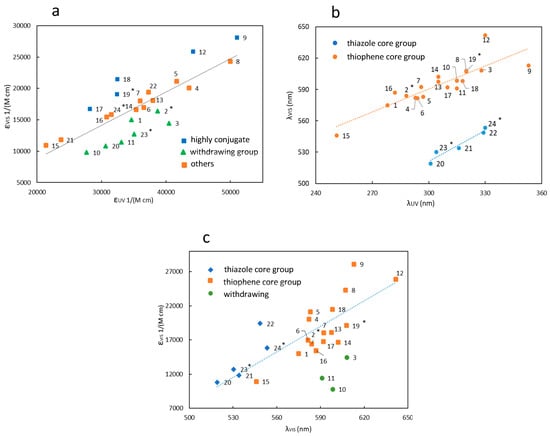 Finally, the relationship between and λVIS is highlighted (Figure 6c), since the behavior of the photochromic molecules in the visible (i.e., the contrast) is relevant for the development of amplitude holograms. The overall evidence is that the longer the wavelength of the peak, the higher its absorption intensity [49], which is a common trend in conjugated molecules [50]. However, the presence of withdrawing groups (e.g., compounds 9 and 10) decreases the absorption coefficient, whereas donor groups lead to higher absorbance (compounds 4–9).