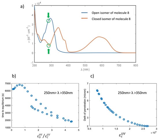 (a) UV-vis absorption spectra of the two isomers of molecule 6; (b) time necessary to reach the photostationary state as function of the ratio ; (c) penetration depth as function of the irradiation wavelength. With the green circles the values of the molar extinction coefficients at the wavelength corresponding to the highest penetration are highlighted. Each point of figure (b) and (c) corresponds to a different simulation with a λ of irradiation changing between 250 nm and 350 nm.