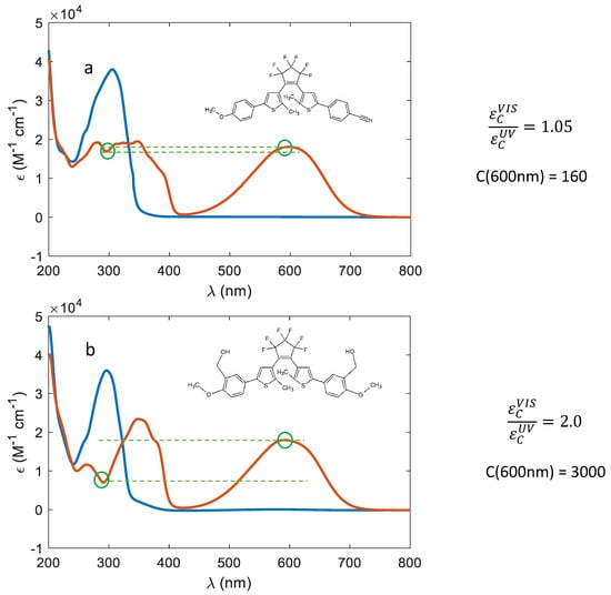 The analogous analysis, but considering the absorption maxima instead of the absorption coefficient, leads to the general conclusion that a redshift of the visible band of the colored form corresponds to a redshift of the UV band of the uncolored form (Figure 6b). The two series of data in the figure correspond to the dithienylethenes (orange data) and the dithiazolylethenes (blue data). For both series, the wavelength gap between the absorption maxima of the colored and uncolored forms is approximately the same inside the members of the same series. In particular, the gap is about 220 nm for the thiazole based series and 290 nm for the thienyl based one. Actually, the presence of electroactive substituents can modify this wavelength gap, i.e., push-pull substituted dithienylethenes (compounds from 12 to 14) are characterized by a larger λVIS-λUV, with the largest difference value for the compound 12, having both very strong donor and acceptor groups.
