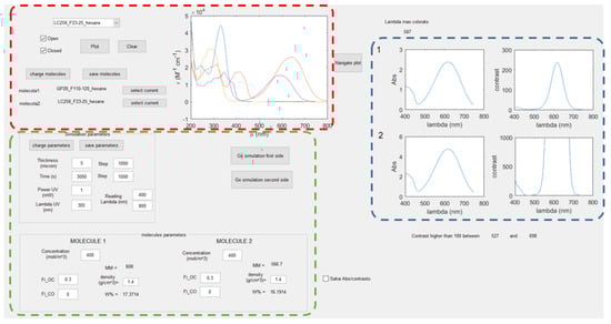 Screenshot of the GUI developed to simulate the absorption properties of photochromic films. The colored boxes indicate three different sections: selection of the molecules (red), parameters choice (green) and results visualization (blue).
