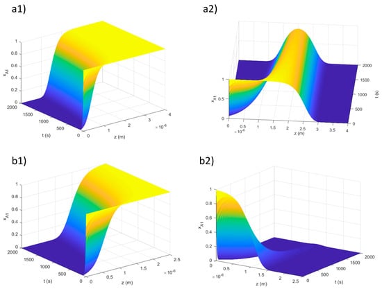 Once we had selected the molecules and the simulation parameters, the computation could start. The program is divided into two steps, enabling us to simulate a double illumination process, with one process for each side of the film. At each stage, the concentration profile of the transparent isomer is plotted, as function of time and space, and the limit of the UV penetration is computed. By the analysis of these plots, it is possible to understand if either the molecular concentrations or the film thickness is too large to have a complete conversion inside the sample volume. In Figure 10, we show examples where the total conversion inside the film volume is reached or not, depending on the material thickness. The plots show the transparent isomer concentration in dependence of time and thickness, after one (a1, b1) and two (a2, b2) sides were illuminated.