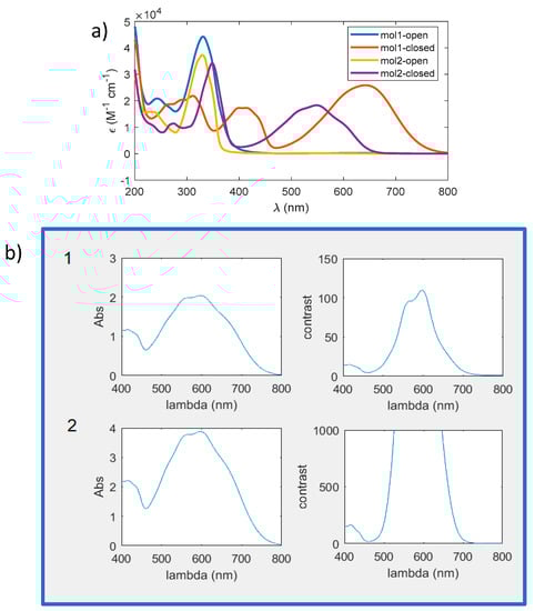 According to the discussions we reported, it is clear how useful such tool can be in designing high performance photochromic films and how many pieces of information can be retrieved from the simulations. Given a desired contrast in a certain wavelength range for a specific application, this tool supports the choice of the right set of molecules to be used. Once they have been selected, the illumination wavelength has to be carefully chosen: should be low, to have a deep penetration through the film, thus achieving a full conversion; moreover, the and ratios should be high in