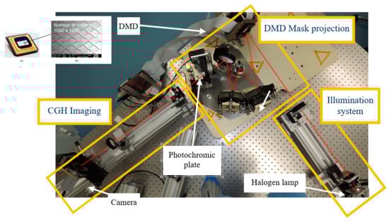 - Zamkotsian, F.; Alata, R.; Lanzoni, P.; Pariani, G.; Bianco, A.; Bertarelli, C. Programmable CGH on photochromic material using DMD generated masks. Proc. SPIE 2018, 10546, 1054606. [Google Scholar]