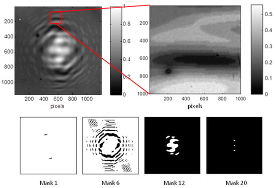 The image is reconstructed at 0.5 m, with a size of 4 × 4 mm2 (Figure 17b). We notice the complexity of the image with small details, which requires a large hologram due to the high information density on its edge. Hologram resolution and size prevented the use of the mask projection technique to obtain the same level of details.
