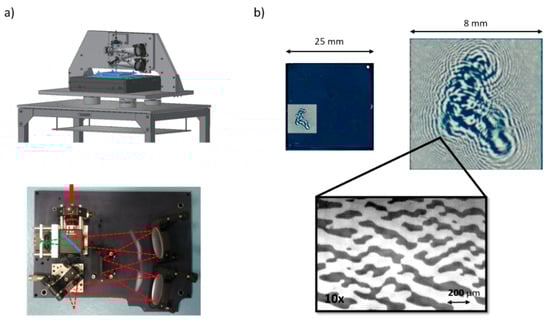 (a) Mechanical (top) and optical (bottom) schemes of our direct laser writing machine; (b) Different magnifications of a typical sample of photochromic film, written with a Fresnel CGH [64].