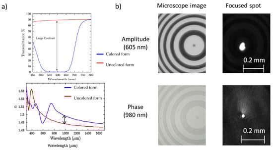 (a) Measured modulation of transmittance and refractive index of a high content photochromic film; transparent form (red line) and opaque form (blue line). The arrows highlight the change in the transparency and refractive index; (b) Left: Microscope images (phase and amplitude) of a Fresnel CGH recorded on a diarylethene based film. Right: CCD images of the laser spot in the focal plane [49].