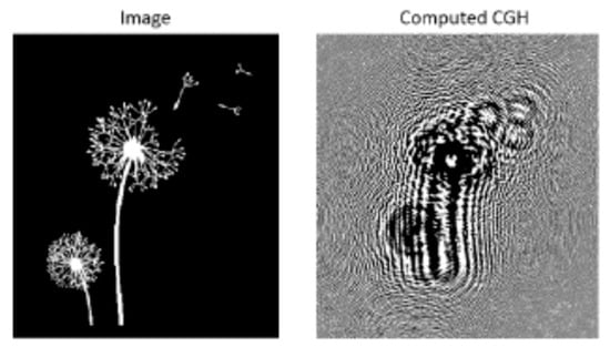Image of a dandelion and the calculated binary Fresnel CGH (4 × 4 mm2 size at a focus of 0.5 m) [64].