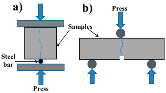 The schematic of prefabricating micro-cracks. (a): the schematic of the splitting test; (b): the schematic of the three-point bending test.