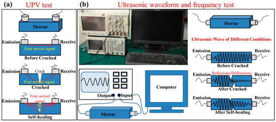 UPV test of mortar samples was measured by a TICO concrete ultrasonic test device (Shenborui Company, Shenzhen, China). The parameters were set as a pulse voltage of 1 kV and the resolution of 0.1 μs. Two sensors with a natural frequency of 54 KHz were used to transmit and receive signals, respectively. The two sensors were placed on the same side of the prisms. The distance between two sensors was 97 mm. Figure 2a shows the schematic diagram of UPV test.