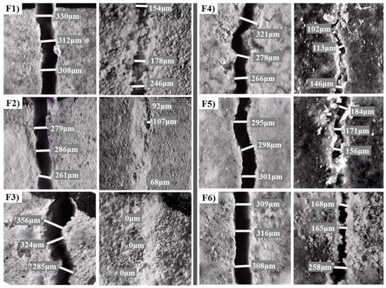 Optical microscope observation is the most intuitive method to evaluate the self-healing of cracks, whose width was measured directly (Figure 3). Two edges of t crack before self-healing were clearly appearance. The initial crack width values, which are the average of three readings for each sample, of F1, F2, F3, F4, F5 and F6 specimens after damage are 317 μm, 275 μm, 322 μm, 288 μm, 298 μm and 311 μm, respectively. When the self-healing reached 30 days in water, the cracks were sealed and the sample surfaces were covered by the white crystalline substance, which was speculated to be CaCO3 precipitates [3,37]. With the increased of content of CaCO3 precipitates, the crack width gradually reduced.