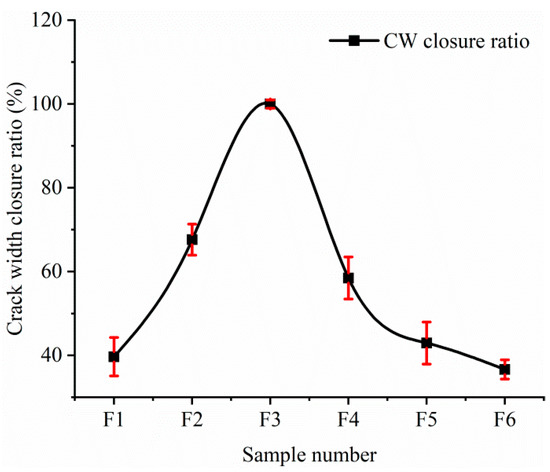 where W0 and W are the initial crack width and crack width after self-healing, respectively. The crack width closure rate of each sample is shown in Figure 4.