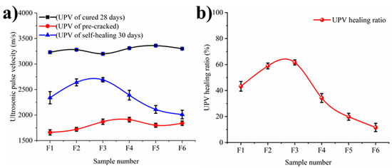 where V1, V2 and V3 indicate the UPV of mortars which is un-cracked, pre-cracked and self-healing, respectively. The UPV healing rates are shown in Figure 5b.