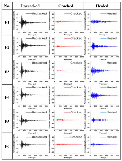 The ultrasonic waveforms of un-cracked samples are significant and present that the maximum amplitudes among all peaks are larger than 20 mV as shown in Figure 6. When the samples cracked, the maximum amplitudes decreased obviously. The result is due to that the ultrasonic energy was weakened by the strong interference of the air in cracks [45,46]. Fortunately, the maximum amplitudes of samples increased when cracks self-healed. The maximum amplitude of F3 sample, especially, increased significantly and showed the best self-healing effect. The reason may be that there were more cement particles in the range of 30~60 μm than other samples, which had strong continued hydration potential for 28 days concrete and produced much hydration products. However, the ultrasonic maximum amplitudes of self-healed samples are still lower than that of the un-cracked samples, which are consistent with the results of UPV test.