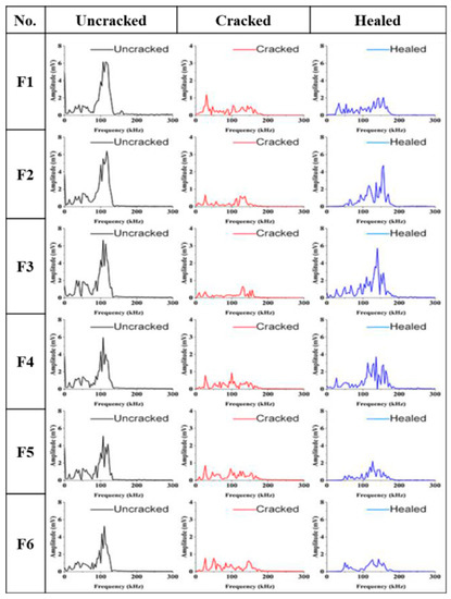 Interference of noise signals in the ultrasonic waveform is inevitable, especially the cracked samples. To show these changes accurately, the Fast Fourier Transform (FFT) with a Gaussian function was used to get more pronounced and clear results [47]. The ultrasonic signal of time domain can be transformed to the signal of frequency domain by FFT, which can also evaluate the variation of ultrasonic waves [48]. Figure 7 shows the ultrasonic frequency graphs obtained by FFT. The dominant frequencies of un-cracked samples are at a resonance frequency of 107 kHz. However, the peaks appearing in the low frequency range are mainly caused by the pores in the mortars [47]. When the samples cracked and the ultrasonic energy was weakened by the cracks, it is hardly to find the existence of the dominant frequencies. However, the dominant frequency of F3 group recovered significantly after self-healing, which indicates that it has the best self-healing effect. It is also consistent with the results of crack width closure and UPV test.