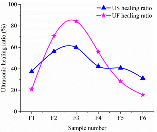 where F1, F2 and F3 indicate the frequency amplitude of ultrasonic wave for un-cracked mortars, cracked mortars and self-healing mortars, respectively. The US and UF healing rates are shown in Figure 8.