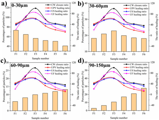 To explore the influence of PSD on the self-healing ability, the corresponding relationship between the volume percentage of cement particles in different size ranges and the self-healing rates are established, as shown in Figure 9.