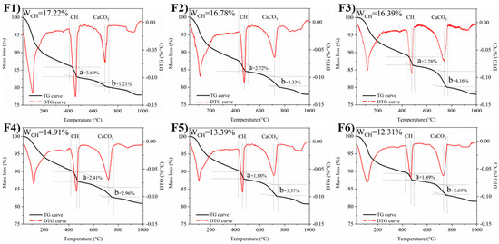 TG analysis of cement pastes before self-healing. (F1–F6) are the group numbers of cement particles with the average size 22.82 μm, 29.78 μm, 39.10 μm 49.96 μm, 60.51 μm and 73.60 μm, respectively.