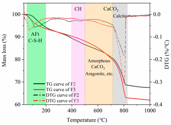 TG analysis was also used to characterize the self-healing products of F2 and F3 samples because of the most products production (Figure 11). It shows the TG curves have the significant weight loss and the DTG curves have the distinct endothermic peaks in the range of 70 °C to 200 °C, which may be caused by the decomposition of Ettringite or the dehydration of the C-S-H gel [49]. It indicates that the un-hydrated cement continues to hydrate. The samples show weight loss again by the TG curves decline from 400 °C to 720 °C, but there are no obvious endothermic peaks in the DTG curves. It may be the decomposition of un-carbonized Ca(OH)2 and the amorphous calcium carbonate with a very small amount. However, it is difficult to distinguish between Ca(OH)2 and amorphous CaCO3 by TG and DTG method [50]. Subsequently, the TG curves decrease sharply and the DTG curves show significant endothermic peaks from 720 °C to 840 °C. This is mainly because of the decomposition of massive calcite [51]. Overall, the results show that calcite is the most important self-healing product, while there is also some continued hydration product.