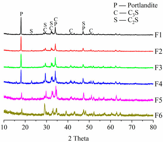 XRD analysis can also determine the products types of hydration and autogenous self-healing. Their peak intensities represent the relative content of products. Thus, the XRD analysis of cement paste before self-healing was used to compare the relative contents of Ca(OH)2 and un-hydrated cement, as shown in Figure 12.