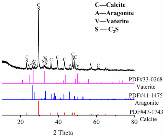 The XRD analysis also confirms that CaCO3 is the mainly component of the self-healing products, as shown in Figure 13. The peaks of Ca(OH)2 are hardly found, which indicates that the Ca(OH)2 in the crack surfaces reacted with dissolved in water [11,50,52]. However, the Portlandite produced by the early hydration of F1 sample was wrapped by C-S-H gel. Consequently, the Portlandite is difficult to dissolve and form CaCO3, which reduces the self-healing ability. In contrast, the F3 sample contains a certain amount of Portlandite which is beneficial to the formation of CaCO3. The Ca2+ released by the continued hydration could accelerate the CaCO3 crystals growing, therefore, the continued hydration promoted the development of carbonation, which improved the self-healing of concrete. However, the CaCO3 produced by the self-healing has different mineral phases. The major product is calcite because of the highest peak intensity, while the weak peaks of aragonite and vaterite are also found. The different mineral phases may be related to the water environment and the content of CO2 [53]. Although the XRD results show that the self-healing product is mainly calcite, it only indicates that carbonation reaction played an important role in the autogenous self-healing. However, the effect of continued hydration of un-hydrated cement cannot be determined, which needs to be explored by other testing methods.
