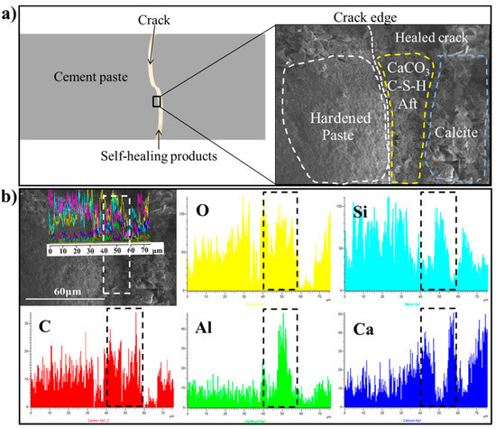 The SEM results show that the early self-healing products are produced by the continued hydration and carbonization, while the later self-healing products are mainly composed of CaCO3. Furthermore, the SEM-EDS analysis on the cross section of healed cracks was performed to reveal that the continued hydration products were covered by the calcite and the continued hydration products were also quantitatively characterized. The selection of the target area is shown in Figure 16a and the linear scan and EDS mapping for the target area are shown in Figure 16b. The atomic ratio plot of the self-healing products is shown in Figure 17 to illustrate the characteristics of the healing products observed.