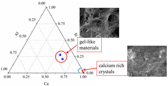 The SEM-EDS results show that the self-healing products are mainly composed of O, Si, C, Al and Ca, as shown in Figure 16. The difference in the content of various elements at different positions indicates the difference of self-healing products. According to the EDS results, there are a large amount of hydration products closest to the hardened paste and formed a product layer with a thickness of 12~22 μm, which suggests that the continued hydration occurred on the surface of cracks at the early age of autogenous self-healing. However, the Ca/Si ratio in the new hydration product is lower than that in the hardened paste. Some calcium ions may be released into the water and form the calcium carbonate. In the later stage of autogenous self-healing, a large amount of CaCO3 adhered to the surface of the continued hydration products and filled the cracks. Therefore, it can be shown that the self-healing was carried out under the combined action of continued hydration and carbonation. Figure 17 shows the continued hydration products and the carbonization products. When the composition of calcium is overwhelming compared to silicon, it indicates that CaCO3 is produced as the calcium rich crystals [54]. While the gel-like materials are the continued hydration products because of a certain amount of silicon and aluminum. Actually, Calcite precipitation is the main factor, which is proved by the XRD and TG analysis.