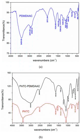 The FT-IR of PATC-PDMDAAC, PATC, and PDMDAAC. (a) The FT-IR of PDMDAAC; (b) the FT-IR of PATC-PDMDAAC and PDMDAAC.