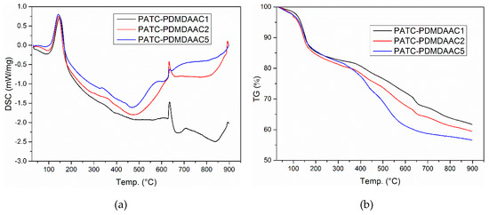 The TG-DSC of PATC-PDMDAAC with various organic/inorganic ratios (organic/inorganic = 0.10 represent PDMDAAC1, organic/inorganic = 0.15 represent PDMDAAC2, organic/inorganic = 0.30 represent PDMDAAC5). (a) the DSC of PATC-PDMDAAC; (b) the TG of PATC-PDMDAAC.