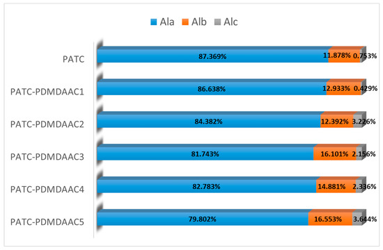 The morphological distribution of Al in the composite flocculant directly affects flocculant performance, whereas that of aluminum may be related to organic components, alkalization degree, proportion of organic and inorganic components, and other factors [22]. The Al-ferron-timed complex colorimetric method is a common and effective technique to study the morphological distribution of Al in hydrolyzed aluminum solution. The morphology of Al was divided into three categories on the basis of the difference in complexation reaction between the colorant ferron and various morphologies after the hydrolysis of aluminum. Ala (monomeric Al species) reacted with ferron in 1 min, Alb (polymeric Al species) reacted between 1 and 120 min, and Alc (colloidal Al species) reacted with ferron within 24 h [23]. In this study, the PATC-PDMDAAC composites with different material ratios were morphologically analyzed. The results are shown in Figure 5. The figure illustrates that the Al in PATC-PDMDAAC mainly exists in the form of Ala. The Ala content of composite flocculant decreased from 87.369 to 79.802% with the increase of PDMDAAC. However, the content of polynuclear hydroxyl complex Alb slightly increased. The Alc content in the form of aluminum polymer also increased compared with PATC. The influence of PDMDAAC in coagulants on the Al morphological distribution is determined by the high pH of PDMDAAC. The addition of PDMDAAC changed the system pH. Increasing pH to a certain extent will promote the reaction between the medium polymer (Alb) and polymer macromolecule (Alc). The PDMDAAC-induced change in Al morphology further indicated that PATC and PDMDAAC are not simply physical mixtures.