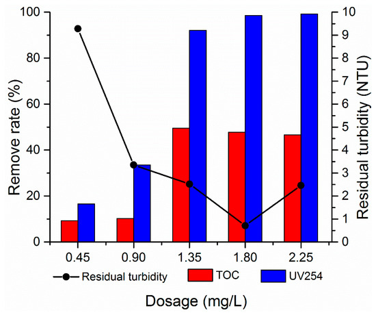 Flocculation is a physicochemical reaction in which a series of equilibrium reactions occurs. The dosage of flocculant has a great influence on the water treatment effect. The effect of PATC-PDMDAAC dosage on flocculation was investigated to evaluate the flocculation performance of PATC-PDMDAAC by controlling a single variable. The PATC-PDMDAAC dosage of 0.45–2.25 mg/L was added to the simulated water. The treatment effect trend after coagulation and precipitation is shown in Figure 6. The turbidity removal efficiency rapidly increased with the increase of PATC-PDMDAAC dosage before 1.80 mg/L. The turbidity decreased to 0.71 NTU at the dosage of 1.80 mg/L and slowly increased with further dosage increase. The 1.35 mg/L dosage had a great treatment effect on TOC of low turbidity and temperature water, and its removal rate was 49.57%. The optimal dosage of UV254 treatment was 2.25 mg/L, and the removal rate was 99.23%. This phenomenon may be due to the Al and Ti ions in the water that were hydrolyzed after PATC-PDMDAAC was added into the water, and the polymerized hydroxyl complex formed in the water collided and neutralized with the negatively-charged particles in the water, thus making the colloid unstable. In addition, PDMDAAC could also be extended to enhance the adsorption and bridging of suspended substances in the water, resulting in an enhanced treatment effect [18,24]. With the further dosage increase, the treatment effect of the coagulant on low-temperature and low-turbidity water was reduced, which may be because a large number of positively-charged hydroxyl complexes were ionized in the water with the further dosage increase. This condition resulted in the re-stabilization of colloidal particles after adsorption and stabilization, resulting in the turbidity increase [25]. When the dosage was 1.80 mg/L, the treatment effects on TOC and UV254 were slightly reduced compared with the optimal treatment effect alone, but it had a good treatment effect on turbidity. Therefore, the dosage of 1.80 mg/L was selected as the optimal treatment effect.