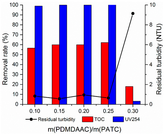 For inorganic–organic compound flocculants, the reasonable ratio of organic and inorganic flocculants is the guarantee of obtaining a good flocculation effect. The dosage of PATC-PDMDAAC was fixed at 1.80 mg/L. Composite flocculants prepared with different m(PDMDAAC)/m(PATC) were used to treat the simulated low-temperature and low-turbidity water. The treatment effect is shown in Figure 7. The results showed that the composite flocculant had a better and stable effect on low-temperature and low-turbidity water when the ratio of organic and inorganic was 0.1–0.25. PATC-PDMDAAC with a composite ratio of 0.15 had the optimal treatment effect on low-temperature and low-turbidity water. The turbidity removal rate could be reduced to 0.56 NTU. The removal rates of TOC and UV254 reached 59.89% and 99.88%, respectively. When the composite ratio was 0.25, the treatment effect on TOC and UV254 slightly increased, but the treatment effect on turbidity decreased. This occurrence is due to the cations with quaternary ammonium salts in the five-membered ring structure of PDMDAAC that show high density positivity and react with PATC after they are compounded. The ionic Ti and Al in PATC transformed to polymerization morphology, and the –CH3 existing around the pyrrole ring structure of PDMDAAC showed a barrier protection effect on positive charge. Accordingly, the potential of the solution to shrink the dual layer increased, and the long chain structure of PDMDAAC produced an adsorption bridging effect, thereby further improving the treatment effect of low-temperature and low-turbidity water [26,27]. Increasing the PDMDAAC content in a certain range was beneficial to the electric neutralization. However, the results showed that the treatment effect of the composite flocculant on low-temperature and low-turbidity water showed a sharp decrease when the ratio of organic and inorganic was 0.30. The residual turbidity was 9.14 NTU, and TOC and UV254 removal rates were reduced to 17.98% and 5.43%, respectively. This finding may be attributed to the organic part of the coagulant that exhibited a particularly strong sweep capacity due to the high organic content. The electroneutralization effect of suspended particles in low-temperature and low-turbidity water with inorganic part in coagulant and the adsorption bridging part with organic part did not reached the balance. However, the curling-sweep effect with organic part begins to occur, thereby leading to the insufficient performance of electroneutralization and adsorption bridging ability; consequently, the treatment effect of PATC-PDMDAAC on low-temperature and low-turbidity water was affected [28]. In combination with economic considerations, the ratio of organic and inorganic of 0.15 to prepare PATC-PDMDAAC was selected as the optimal preparation condition. Therefore, the ratio of organic to inorganic compounds in a certain range should be improved.