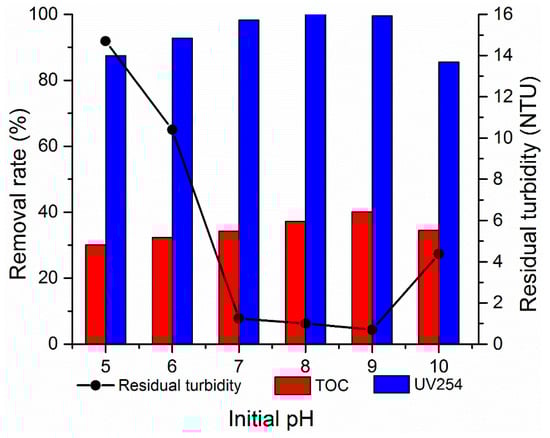 The pH of raw water is one of the important factors affecting the flocculation effect; the pH affects flocculation by influencing the potential of colloidal particles in water [29]. In this section, the effects of different pH values on the removal efficiency of turbidity, TOC, and UV254 were investigated. The 0.01 mol/L NaOH and 0.01 mol/L HCl solutions were adopted to adjust the pH of simulated wastewater. Approximately, 1.80 mg/L composite flocculant PATC-PDMDAAC (the ratio of organic and inorganic was 0.15) was added to the simulated water with different pH values. The results are presented in Figure 8. The figure shows that the removal rates of turbidity, TOC, and UV254 first increased and then decreased with the pH increase. Turbidity increased after coagulation and precipitation under the condition of solution pH < 7.0. The removal rate of UV254 was lower than 90%. This phenomenon was attributed to the inorganic components of the composite flocculant PATC-PDMDAAC that mainly exists in the form of hydrated ions in the solution when the pH value is low, and their adsorption capacity is weak. Several colloidal particles in the suspension were adsorbed, and a large number of particles remained in the upper liquid, resulting in the floc formation with a small particle size and the supernatant with high turbidity [30]. With the increase of pH value, the treatment effects of PATC-PDMDAAC on turbidity, UV254, and TOC accordingly increased. When the pH value was nine, the removal rates of turbidity, TOC, and UV254 were 93% (0.7 NTU), 40.16%, and 99.58%, respectively. Several reasons may explain these results. By contrast, the amount of –OH in the water increased with the pH increase. The hydration ions further hydrolyze to form polynuclear hydroxyl complex ions with high degree of polymerization. The mononuclear hydroxyl group of Al(III) was further polymerized through collision to form polynuclear hydroxyl complex Alx(OH)y(3x−y)+, which plays an important role in electroneutralization. On the contrary, increasing the reaction pH can contribute to the degree of polymerization of polysilicic acid, Al3+, and Ti4+, neutralize the charge, reduce the electrostatic repulsion, and shorten the distance between the particles. Accordingly, the bridging connection of the long polymer chain to the particles was facilitated. The –C=O and –NH2 in the polymer long chain formed hydrogen bond adsorption with –OH or –O on the surface, and the particles were adsorbed through the bridging connection between particles [31]. However, the removal efficiency of turbidity, UV254, and TOC sharply decreased when the pH value was greater than nine. This occurrence may be due to polynuclear hydroxyl complex ions, which formed water-insoluble Al(OH)3 under strong alkali when the pH value was particularly high. Consequently, the adsorption can only be partially exerted, and the effect of treatment was reduced. The comprehensive analysis indicated that the optimal pH reaction condition was selected to treat low-temperature and low-turbidity water as a coagulant when the pH of the simulated water sample was 9.0.