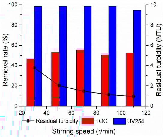 While the stirring speed is particularly fast during flocculation, then it will break the large solid particles into small ones. This occurrence will cause particles that can be precipitated to be crushed into particles that cannot be precipitated [32]. By contrast, if the stirring speed is particularly slow, then the flocculant can only partially contact with solid particles, which is non-conducive to the collection of colloidal particles by the flocculant. The concentration distribution of the flocculant is non-uniform, which is non-conducive to play the role of flocculant. The appropriate mixing speed is conducive to improve the flocculation effect. Therefore, the effect of stirring speed is investigated in this section. The initial pH of the simulated water sample is fixed at 9.0, and the coagulant with an organic and inorganic ratio of 0.15 is added at 1.8 mg/L. In the same rapid mixing process, the influence of the stirring speed values of 30, 50, 70, 90, and 110 r/min on the flocculation effect is investigated, and the results are presented in Figure 10. As shown in Figure 10, the rapid stirring has an enhanced effect in terms of turbidity removal effect. At the stirring speed of 110 r/min, the turbidity dropped to the lowest value of 0.94 NTU. The treatment effect of UV254 is relatively stable, and the removal effect reached more than 90%. Rapid stirring can accelerate the contact between the coagulant and the colloidal particles in water. When –COOH in humic acid molecules complexates or chelates with Ti4+ and Al3+ or hydrolysates, the double-layer of colloidal particles is compressed to provide full influence to the effect of electroneutralization [33]. In the stirring process, the long chain of PDMDAAC can be adsorbed and linked by electrostatic attraction, van der Waals force, and hydrogen bond force through the active parts and the colloidal particles. The fine suspended substances are incompletely destabilized; thus, the flocs can realize further collision and aggregation and form larger flocs [34]. The removal effect of TOC first increased and then decreased. The optimal treatment effect is achieved at a stirring speed of 70 r/min, and the removal rate is 55.19%. If the mixing speed is particularly fast, then the aggregates will be broken. The long chain of the polymer will be also broken to reduce the coagulation effect. In combination with the treatment trend of turbidity and economic benefits, the stirring rate is controlled at 110 r/min.