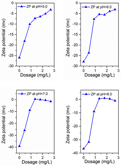 The charge condition of the flocculant and its reaction process is also a key factor to explain the electroneutralization performance of the flocculant. The reaction mechanism is usually understood in the ZP form. The ZP of supernatant after flocculation was investigated with different dosages of PATC-PDMDAAC at various pH environments to effectively understand the flocculation process and mechanism of PATC-PDMDAAC. The removal effects of turbidity, UV254, TOC, and ZP were analyzed to investigate the reaction mechanism. The results are displayed in Figure 11a–d, and the ZP of the prepared composite flocculant was approximately 3.75 mv, which is higher than that of the inorganic flocculant [18]. This condition was attributed to PDMDAAC, which is a cationic organic polymer composite flocculant, with a positive charge on its surface. Therefore, the potential will increase when combined with PATC. As illustrated in Figure 11a, the ZP value of simulated water varied from −26 mv to −45.1 mv before flocculant addition with the pH increase. The ZP increased with flocculant dosage under acidic environments. Such ZP increased from −26 mv to −3.2 mv with the increase in PATC-PDMDAAC dosage from 0 to 2.7 mg/L at pH 5.0. The ZP first increased and then decreased with the increase in flocculant dosage under neutral and alkaline environment, and it changed from negative to positive as the dosage increased. The maximum ZP (8.77 mv) was observed at pH of 10.0 and dosage of 2.25 mg/L. The ZP increase was due to electroneutralization between the added PATC-PDMDAAC and the negatively charged humic acid-kaolin particles [35]. Figure 11b–d shows the effects of turbidity, TOC, and UV254 under different pH and dosage conditions. The figure shows that the treatment effect of turbidity and TOC was worse in an acidic environment than that in neutral and alkaline conditions. The pH for the treatment effect of UV254 exhibited little effect on the removal rate after the dosage was greater than 1.35 mg/L. Comprehensive analysis of the treatment effect of coagulant on low-temperature and low-turbidity water showed that the treatment effect was optimal when the pH value was nine, and the dosage was 1.80 mg/L. The removal rates of TOC and UV254 were 96.68% and 65%, respectively, and the turbidity can be reduced to 0.81 NTU. The corresponding ZP was 2.1 mv. The ZP was greater than zero when the treatment effect reached its maximum. This finding indicated that PATC-PDMDAAC has not only an electric neutralization effect but also an adsorption effect in the treatment of low-temperature and low-turbidity water. This result was consistent with the previous analysis that Al accounts for a large proportion in morphological analysis of aluminum coagulant and can play a better role in electrical neutralization. Combined with the treatment effect and ZP result analysis, PATC-PDMDAAC treatment of low-temperature and low-turbidity water may be the main role of electrical neutralization and adsorption bridge.