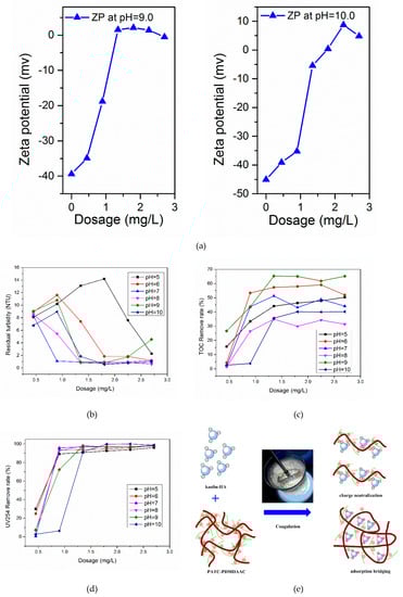 Zeta potential analysis diagram and treatment effect under different pH and dosage: (a) zeta potential analysis, (b) turbidity treatment effect, (c) TOC treatment effect, (d) UV254 treatment effect, and (e) mechanism diagram of the coagulation process).