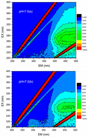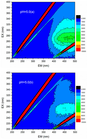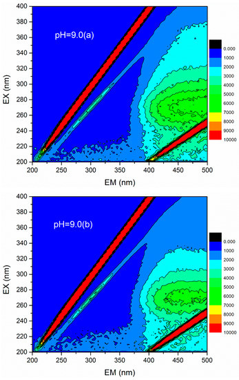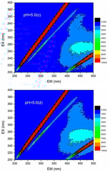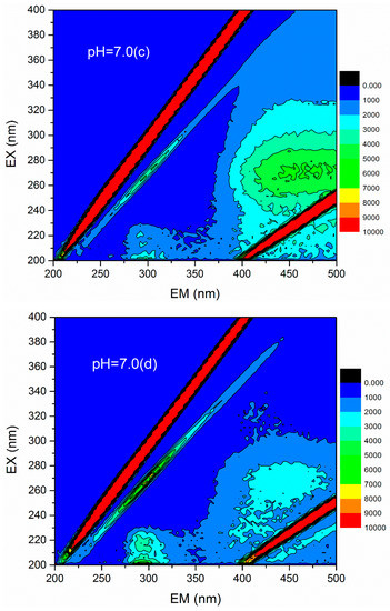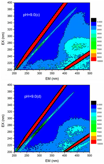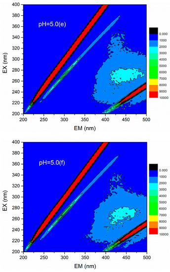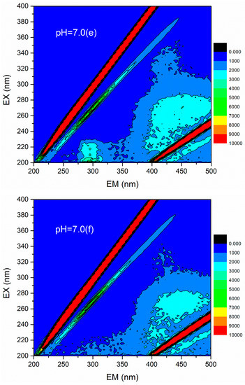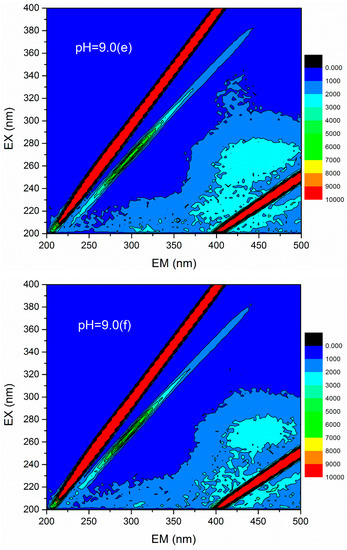3D fluorescence spectroscopy is widely used to quantitatively or qualitatively describe the physical and chemical properties of organic compounds in water due to its various advantages, such as fast test speed, good selectivity, and no damage to the sample structure [36]. The 3D fluorescence spectrum was employed to analyze the HA variations in flocculation of humic acid-kaolin composite water. This approach was initiated to further evaluate the flocculation process. The 3D fluorescence spectra were measured with an F-4600 fluorescence spectrophotometer (Hitachi, Tokyo, Japan). The range of excitation wavelength (EX) was 200–400 nm, the step length was set to 2 nm, and the emission wavelength (EM) ranged from 200 to 500 at 3 nm sampling increments. The scanning speed was controlled as 12,000 nm/min. In this study, the changes of 3D fluorescence images in simulated water with different coagulant dosages (a = 0 mg/L, b = 0.45 mg/L, c = 0.90 mg/L, d =1.35 mg/L, e = 1.80 mg/L, and f = 2.25 mg/L) were investigated under acid, base, and neutral conditions (pH = 5.0, 7.0, and 9.0). The results are shown in Figure 12. The data matrix of 3D fluorescence spectra of simulated water samples was analyzed under different pH conditions and dosages. Accordingly, the corresponding emission/excitation wavelength and fluorescence intensity of the fluorescence peaks after each dosages were obtained, as shown in Table 2. Figure 12 shows that the response value of the 3D fluorescence image of raw water (the dosage of PATC-PDMDAAC was 0 mg/L) was mainly distributed in the EM range = 380–500 nm, and the EX = 250–400 nm, which was mainly the distribution area of a type of humic acid. The fluorescence intensities of 7219 and 7053 at pH values 7.0 and 9.0 were higher than that of 5558 at pH 5.0; this outcome may be due to the dissociation of a large number of acidic functional groups in the humic acid molecules as pH increased, resulting in the bonding electrons being exposed and fluorescence enhancement [37].