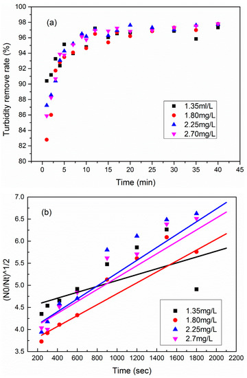 Turbidity removal rate with different PATC-PDDAAC dosage changes with flocculation time (a), and (N0/Nt)1/2 changes with flocculation time (b).