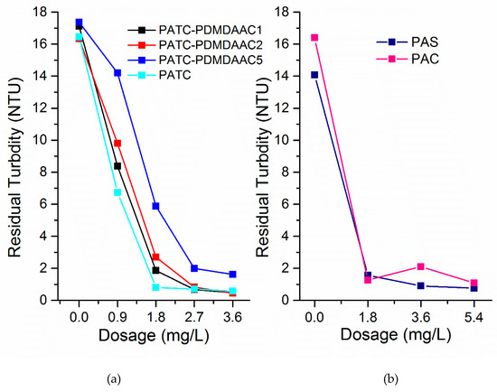 Comparison of effects of PATC-PDDAAC, PATC, PAS, and PAC on low-temperature and low-turbidity water in the Xiangjiang River. (a) the effect of PATC-PDMDAAC and PATC; (b) the effect of PAS and PAC.