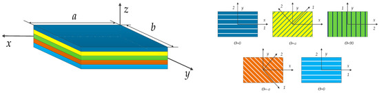 The mechanical properties of the composite laminate structure were related to the mechanical properties and thickness of the single-layer board, as well as the fiber laying direction and sequence and the number of layers. The laminated plate shown in Figure 1 consisted of five layers. The angle of the first layer was 0°, and the other four layers were expressed as α, 90°, −α and 0°, respectively. The principal axis coordinate system of each layer in laminated composite plates was O12, and the global coordinate system was Oxy. The ply-angle of the fiber can be expressed by θ, and the positive direction was identified when the x-axis rolled towards the 1 axis in an anticlockwise direction. The material of the plate structure in this chapter was a fiber-reinforced composite material, which was composed of matrix and fiber. The matrix was mainly used to support and protect the fiber, while the fiber was enhanced and mainly supported. In addition, the coupling vibration of bending and stretching of composite laminate plates is not considered in this chapter.