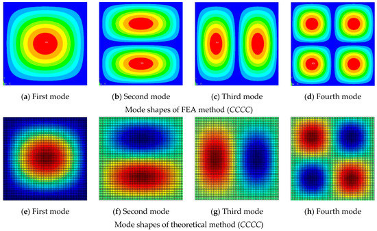 In order to determine the modal characteristics of the laminated composite plate, one needs to solve the characteristic equation by setting the external force vector F in Equation (20) to zero. Obviously, the natural frequencies and eigenvectors of the laminated composite plate can now be easily obtained by solving a standard matrix Eigen problem. Since the components of each eigenvector are actually the expansion coefficients of the Fourier series, the corresponding mode shape can be directly determined by substituting the eigenvector in Equation (17) into Equation (19).
