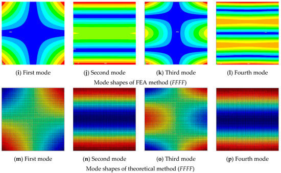 Mode shapes of the composite laminated plate. (a,e,i,m) First mode, (b,f,j,n) Second mode, (c,g,k,o) Third mode, (d,h,l,p) Fourth mode.
