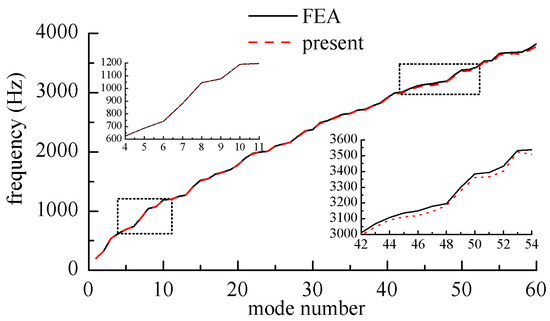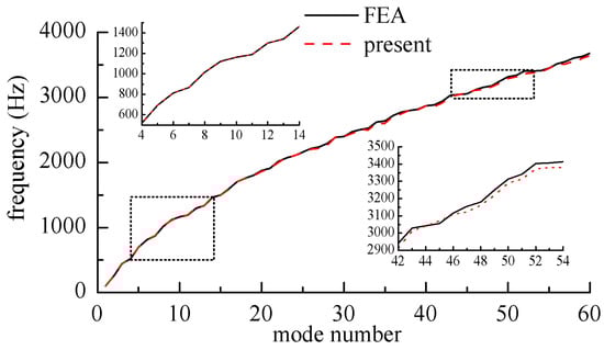 In Figure 4 and Figure 5, the frequency curves obtained by this method coincided with those obtained by the finite element method at medium and low frequencies. At high frequencies, the results obtained by the finite element method were larger than presented results. This was because the finite element method needs finer meshes in order to get more accurate results in the high frequency band, with the workload increasing sharply.