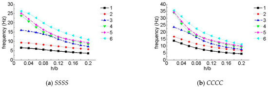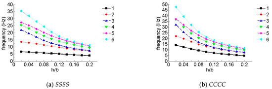 To research the influence of different ratios between thickness and width, the first six non-dimensional frequency parameters for the SSSS and CCCC laminated composite plates are shown in Figure 6 and Figure 7, where the number of piles in the figures were three layers and five layers, respectively. As can be seen in the figures, compared with low-order frequency parameters, high-order frequency parameters showed a remarkable decrease with an increase in the ratio between thickness and width; moreover, the change was more significant when h/b was less than 0.10.