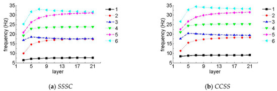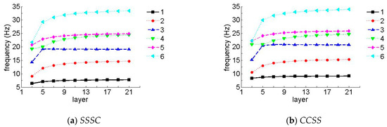 It can be seen in Figure 8 and Figure 9 that the frequency parameters increased with the increase in the number of layers, so long as the number of layers was less than 13, in which case, it stayed constant as the number of layers changed. It should be mentioned that the effect was more noticeable for higher frequencies.