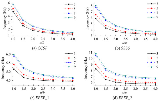 In order to study the influence of the number of layers laid on the vibration frequency, Figure 10 shows the variation of the dimensionless frequency of the first order with the number of layers and the aspect ratio of the normal symmetric angled plywood structure under different boundary conditions. Among them, the laying angle of the laminate was 45°, and h/b = 0.1.