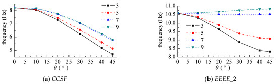 The laying angle was another important design parameter of the laminate. Figure 11 shows the variation of the first-order vibration frequency with the laying angle of the composite laminate under different layers.