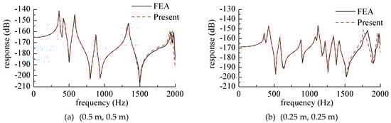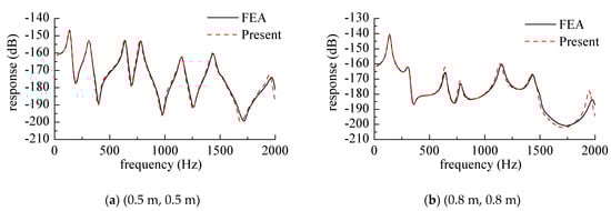 In this section, the following example is focused on the vibration harmonic response of the plate. In order to avoid the numerical instability under the excitation of the plate structure resonance frequency in the numerical calculation, the structural damping factor η is introduced in the analysis, and the elastic modulus of the plate structure is correspondingly the complex elastic modulus, E’ = E(1 + jη). To avoid the instability of the response at the resonant frequency, the damping factor η (loss factor value) of the plate structure herein is η = 0.01.