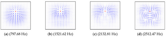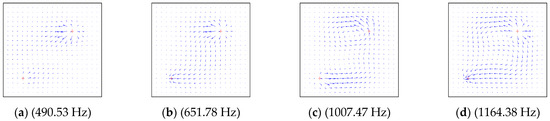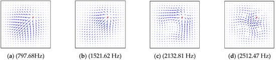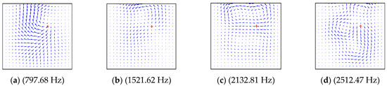 Figure 17a–d shows the power flow vector graphs at first to fourth natural frequencies. It can be seen from the figure that the vibration energy was transmitted from the excitation to the surrounding plate, but the excitation position was not always the source of vibration energy output. Under some excitation frequencies, the excitation position may also have the flow of vibration energy, which further verifies that the energy transfer was strongly dependent on the excitation frequency.