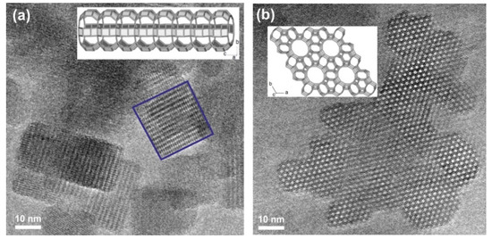 High-Resolution Transmission Electron Microscopy (HRTEM) images of LTL nanocrystals projected along the directions [100] in (a) and [001] in (b) (SG P6/mmm).