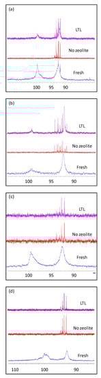 The evolution of ZDDP was further examined by 31P NMR spectroscopy. The transformation of the broad features resulting from the tetrahedron structure of Zn metal center [30] into sharp narrow peaks at lower chemical shifts gives a clear indication of thermal degradation and oxidation [31]. Upon aging at 150 °C, the broad feature vanished completely in absence of zeolite nanocrystals (Figure 2), leading to say that the ZDDP is completely decomposed. The set of peaks present at 90–95 ppm corresponds to (RO)2P(S)SR’, a rearrangement product resulting from a high thermal stress of ZDDP. On the other hand, despite of the partial dissociation of ZDDP in SA-C2 and SA-C3 aged in the presence of LTL, the broadening is clearly identified in their 31P NMR spectra giving a definitive proof of their preservation. This result reveals the more important role for LTL than that suggested by the FTIR experiments.